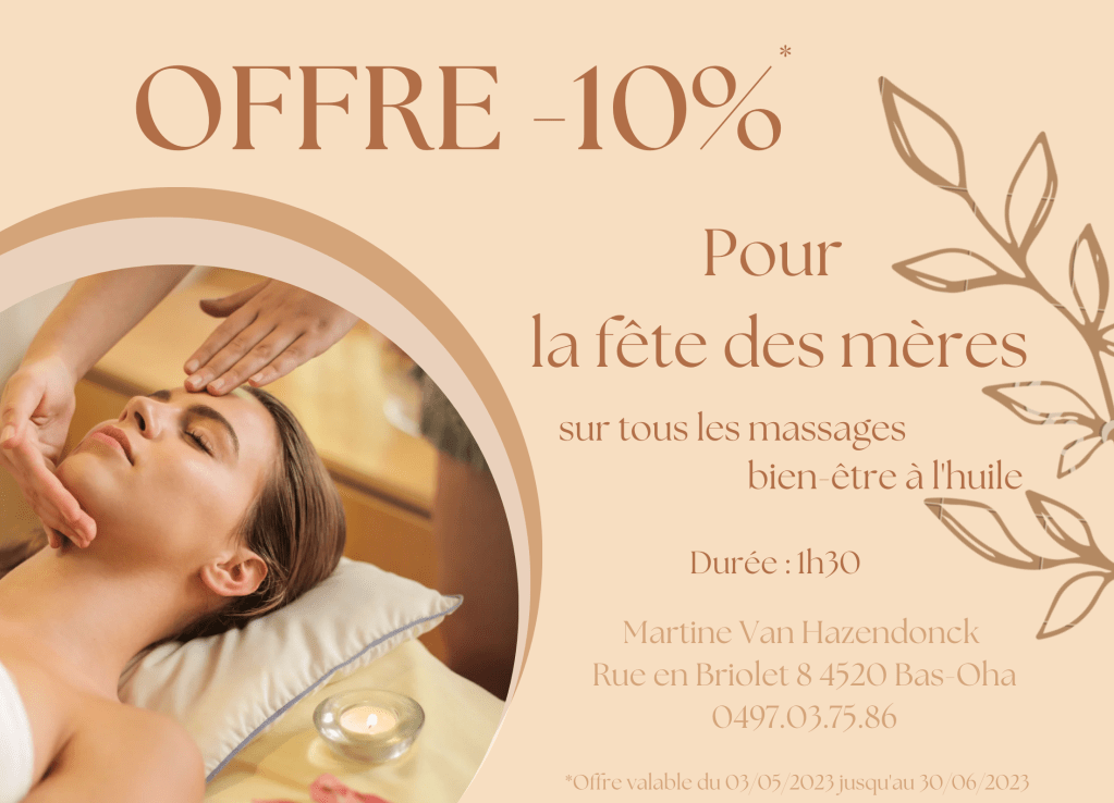 A l’occasion de la fête des mères, profitez d’une ristourne de 10% sur tous les massages.